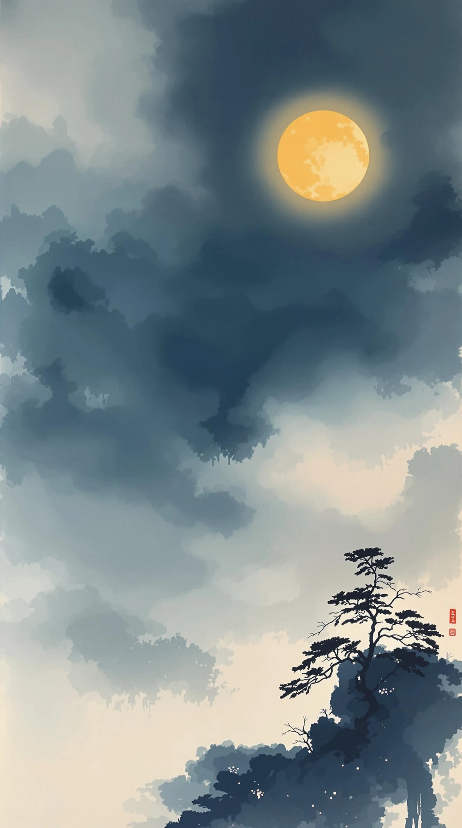 Traditional Chinese landscape painting in Zhang Daqian's signature splashed-ink style. Single contemplative figure silhouetted against a glowing sunset orb, positioned according to classical Song Dynasty compositional principles. Vast misty sky rendered in subtle gradients of indigo, ochre, and pale rose. Ethereal atmosphere created through Zhang's characteristic splashed-ink technique (pocai), with controlled accidents in mineral pigments. Landscape elements: distant mountains dissolving into mist, subtle pine trees, suggestion of water below. Color palette: deep indigos, burnt siennas, muted golds, with strategic touches of mineral blue-green. Brushwork varying between precise figuration and abstract expressionist splashes. Technical elements: traditional ink and mineral colors on silk or paper, visible texture of materials. Composition: dramatic empty space (liu bai) emphasizing atmospheric perspective. Scale: traditional hanging scroll proportions. Mood: profound solitude and connection with nature. Style fusion: classical Song Dynasty refinement with Zhang's modernist abstractions.
