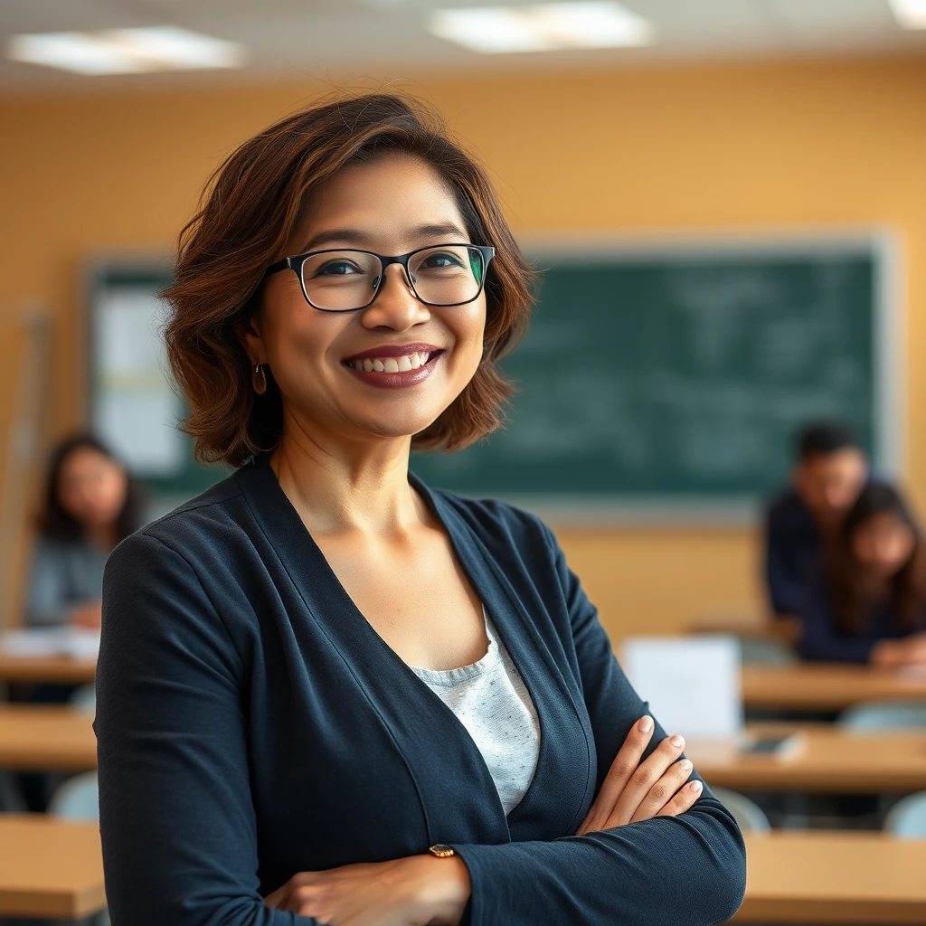 Create horizontal realistic landscape of a very beautiful 45-year-old Vietnamese lecturer is teaching AI in a classroom, with a slightly Rectangular face, wearing glasses, thin lips, so curly brown shoulder-length hair, a radiant, smiling face, mouth a bit wide, a small, high, elegant nose, tanned skin, sporty figure with a proud and emotional smile. The image is a full-body shot, very clear background, captured with high-resolution photography using a Canon EOS R5 camera, looking like a real photo.