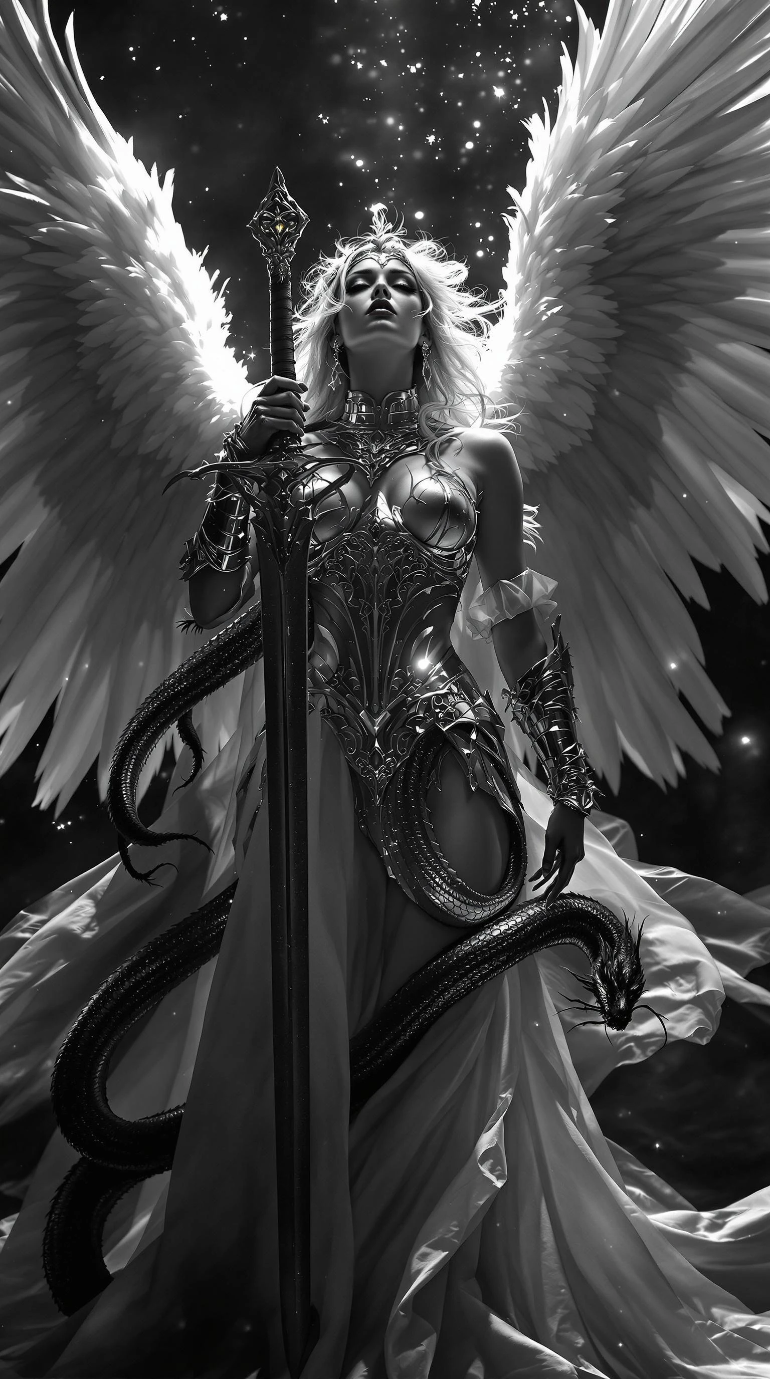 IMG_20231115_1236_001.3fr: High contrast black and white cinematic photograph, ethereal female angel warrior, Renaissance-inspired dramatic composition, victory pose with ceremonial sword, defeated serpent artistically draped, chiaroscuro lighting style, silver metallic armor details, flowing ethereal fabric, dramatic wing spread catching rim light, photorealistic 8k detail, shot on Hasselblad medium format, film noir aesthetic, volumetric light beams, high dynamic range monochromatic tones, professional studio lighting setup, sharp focus on face and sword details, motion in fabric and feathers, baroque-inspired dramatic poses, deep shadows and brilliant highlights, professional fashion photography techniques, subtle mist effects, spiritual warfare aesthetic