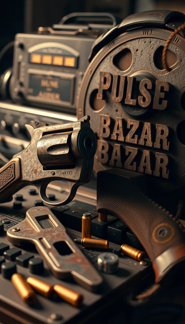 hyper-realistic, cinematic scene with intricate details: old rusted revolver with his bullets as a voloume turned to DYI AKAI MPC audio sampler and DYI AKAI reel to reel tape recorder carved to spell with big font ”Pulse Bazar: Spaghetti Western”, highly detailed, with many 3.5 mm audio cable pluged in and headphone in background