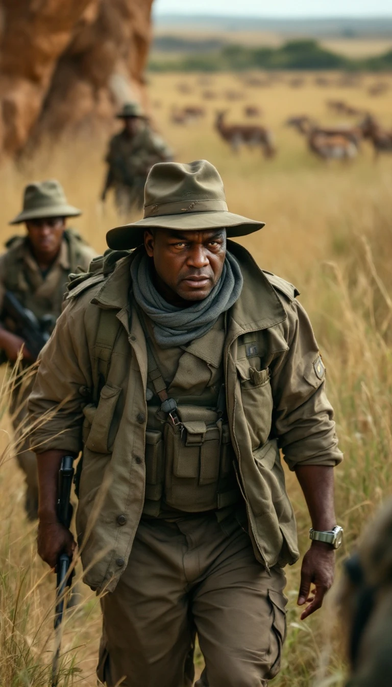 Cyril Ramaphosa leads a team of South African soldiers through the savanna, the muted green and tan of their camouflage blending into the wild grass around them. His uniform is disheveled, his jacket slightly torn from brushing against the tall grasses, while his wide-brimmed military hat is dented from days of wear. His rifle is firmly aimed at the ground, ready for any sudden threats. His determined expression cuts through the heat as he scans the horizon, calculating every step. The soldiers follow him with measured caution, moving through the tall grass in perfect synchronization, their boots leaving deep prints in the soil. The scorching African sun beats down on them, causing sweat to drip down their foreheads. In the distance, a herd of antelope grazes peacefully, unaware of the silent danger nearby. Ramaphosa pauses, gesturing for his team to take cover behind a rocky outcrop, the tension in the air palpable. The camera focuses on his rugged appearance—the creased tactical vest, a camouflage band around his arm, and the dirt streaking across his face—as he surveys the terrain, prepared for any hostile encounter.