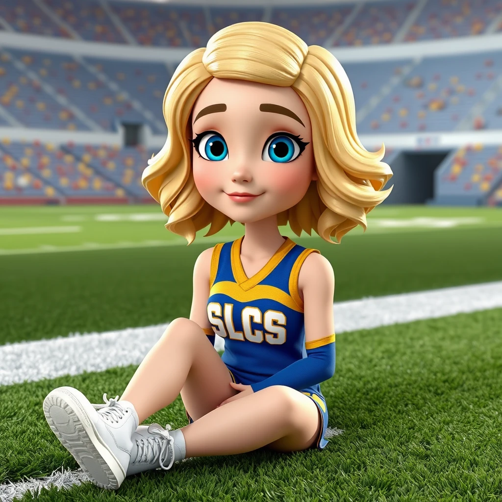 Disney Pixar 3d animated movie character. Real 3d style. Pretty blonde woman, short wavy hair, big blue eyes. Pale skin. Attractive. Cheerleader uniform in blue and gold with the letters SLCS. White sneakers. Sitting on AstroTurf in a football stadium.