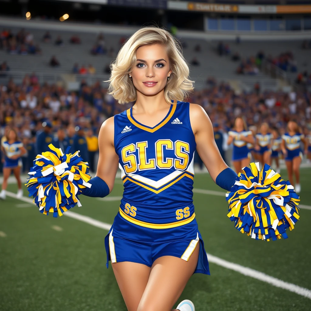 Realistic photo. Pretty blonde woman 22 years old, short wavy hair, big blue eyes. Pale skin. Attractive. Cheerleader uniform in blue and gold with the letters SLCS. White sneakers. Dancing on AstroTurf in a football stadium with pompoms.