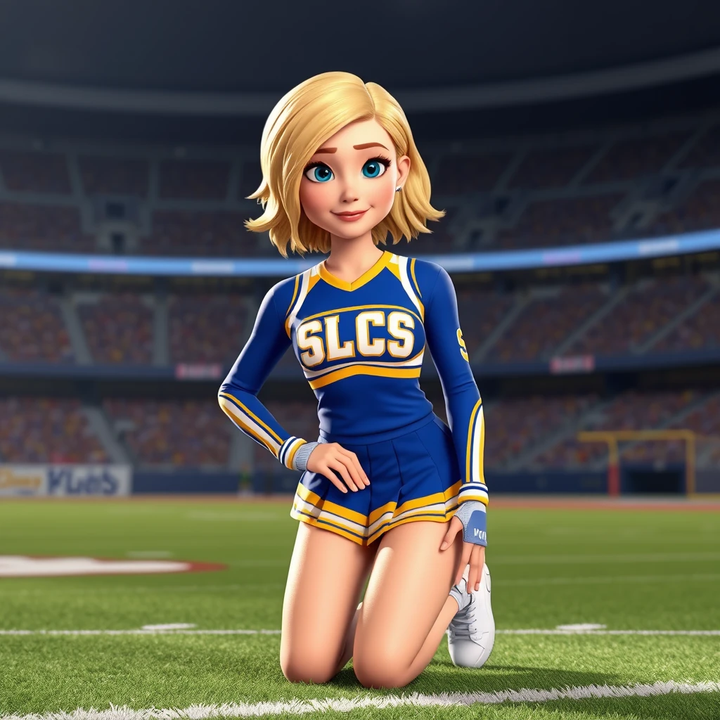 Disney Pixar 3d animated movie character. Real 3d style. Stunning beautiful blonde woman age 25, short wavy chin-length hair, blue eyes. Pale skin. Cheerleader uniform in blue and gold with the letters SLCS. Pleated skirt. White sneakers. Kneeling on AstroTurf in a football stadium.