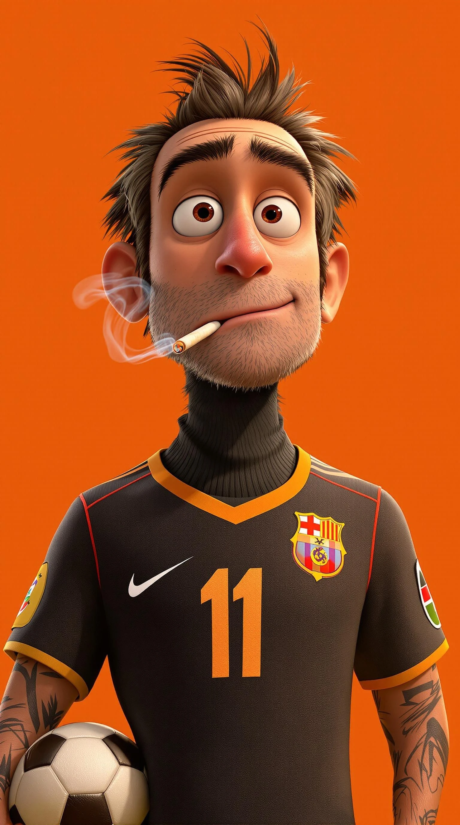 3D animated character in signature Pixar art style, ultra HD rendering of soccer legend Crow, highly detailed facial features with Pixar's characteristic expressiveness, wearing soccer uniform with jersey number clearly visible, photorealistic texture on fabric and skin, vibrant solid orange background, characteristic Pixar lighting with rim highlights and soft shadows, large expressive eyes, subtle facial wrinkles and skin detail, hair strands with individual definition, subtle subsurface scattering on skin, cigarette with wispy smoke trails, strong depth of field, award-winning 3D animation quality, 8K resolution, physically-based rendering, ambient occlusion, volumetric lighting, centered composition, slight smirk expression, soccer ball positioned nearby, cinematic color grading, clean silhouette against background, global illumination, subtle film grain.