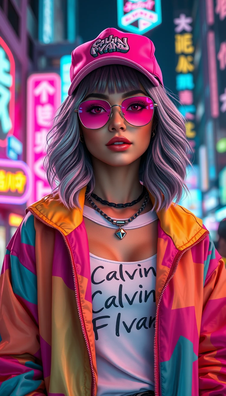 Create a highly detailed, stylized portrait of a woman with a modern, urban streetwear vibe in a neon-lit cityscape in 3D. 1. **Character Details:** - The woman has shoulder-length, wavy hair that transitions from darker roots to silvery pastel tones, softly illuminated by neon lights. - She wears oversized aviator-style glasses with reflective lenses that catch the glow of nearby neon signs. - Her expression is confident and slightly curious, with parted lips adding a subtle sense of allure. 2. **Clothing and Accessories:** - She is dressed in a vibrant, oversized jacket with bold multicolored patterns, blending shades of pink, teal, yellow, and orange. The material has a glossy, futuristic texture. - Under the jacket, she sports a white tank top with bold black text ("Calvin Fvand") printed on it, adding to the casual streetwear style. - A chunky necklace with a geometric pendant sits around her neck, adding a touch of edge to her look. - She wears a pink snapback cap with white graffiti-like text on the front, tilted slightly backward for a stylish, relaxed feel. 3. **Lighting and Atmosphere:** - The environment is rich with neon hues, including pinks, blues, and yellows, creating a cyberpunk ambiance. - The lighting creates a soft, glowing rim light effect on her hair and clothing, enhancing the futuristic aesthetic. - The background is slightly blurred, featuring out-of-focus neon signs, glowing advertisements, and a bustling city vibe, emphasizing depth and immersion. 4. **Composition:** - The perspective is slightly low-angle, making the woman appear confident and dynamic. - The focus remains sharp on her face and upper body, with a shallow depth of field to isolate her from the vibrant yet busy background. This scene captures a mix of futuristic fashion, urban culture, and vibrant neon aesthetics. It evokes a sense of individuality, style, and confidence set against a lively, futuristic city backdrop. High Dynamic Range, Highly Detailed, 8K, Render in 3D, Gasant.