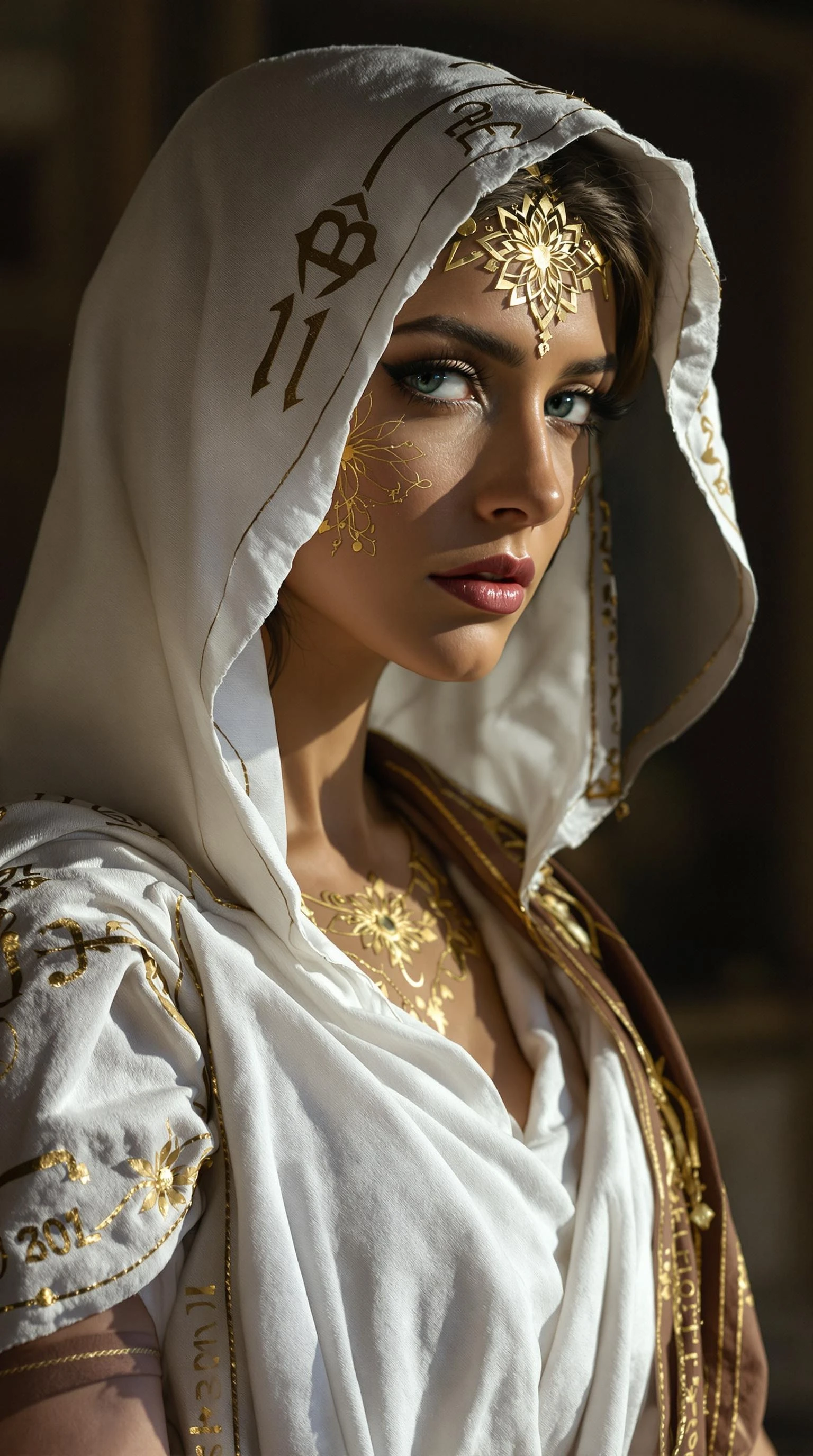 upper body portrait in a realistic photo style, striking woman in a white toga with a delicate fabric hood, captured in natural light, enigmatic beauty embellished with real gold leaf floral designs, intricate runes illuminated by soft, radiant light, authentic photo texture, Atmospheric Dread, captured in high-resolution photography with naturalistic colors and lighting