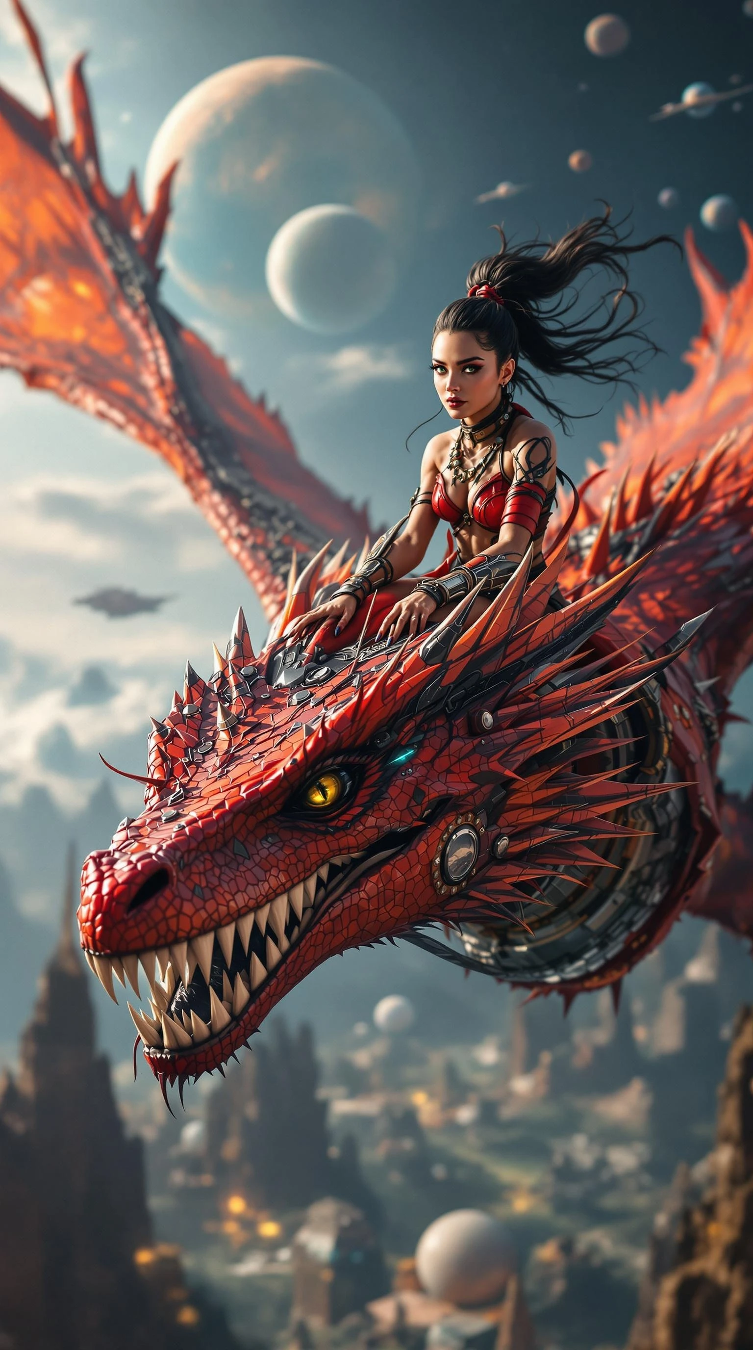 Character: a female Galactic Space Dragon Warrior flying a red therizinosaurus Position: a close-up of a woman's face with the fierce dragon flying in the background Action: red dragon space warriors riding their dragons flying through space Details: highly detailed texture of an dragon with red details, a fierce dragon, a flying therizinosaurus, with a red dragon warrior sitting on top, the warrior is a gorgeous tribal woman, beautiful face, raw beauty, natural beauty, she's got a dark high ponytail, bright green eyes, shiny red tribal armor and a gorgeous strong body with a very tanned skin, she is riding the dragon in a leather saddle with a leather rein. Setting/Environment: Close-up against a backdrop of the City of Lost spaceships, with vessels from various eras and galaxies visible in the blurred distance Background Elements: Different planets are floating in the background through space. Ships like futuristic spaceships, and steampunk airships, partially visible, adding to the atmosphere Color Scheme: Rich, saturated colors—deep blues, fiery oranges, and metallic hues, with contrasts between the spaceship and the environment Artistic Style: Hyper-realistic oil painting with intense detail, cinematic lighting, and sharp contrasts Lighting Effects: Dramatic side-lighting creating striking shadows on the ship, highlighting it's raw textures and details Texture Details: Detailed texture Camera Angle/Perspective: Close-up, side angle view from an extremely low angle, dynamically zoomed along the subject Action Context: The dragon is flying away from an intergalactic space pirate faction, floating in the midst of a dystopian world where the past and future collide Cultural Influences: The Dutch comic book Storm by Don Lawrence and a fusion of Caribbean pirate heritage with futuristic dystopian elements, Dune movie backgrounds Additional Elements: Surreal, foggy atmosphere blending natural elements with decaying futuristic structures Technical Details: Ultra-high-definition, 8K resolution, Unreal Engine 5 rendering, with every intricate detail sharply defined Composition: Rule of thirds, placing the dragon's figure slightly off-center, with the blurred cityscape and ships adding depth in the background
