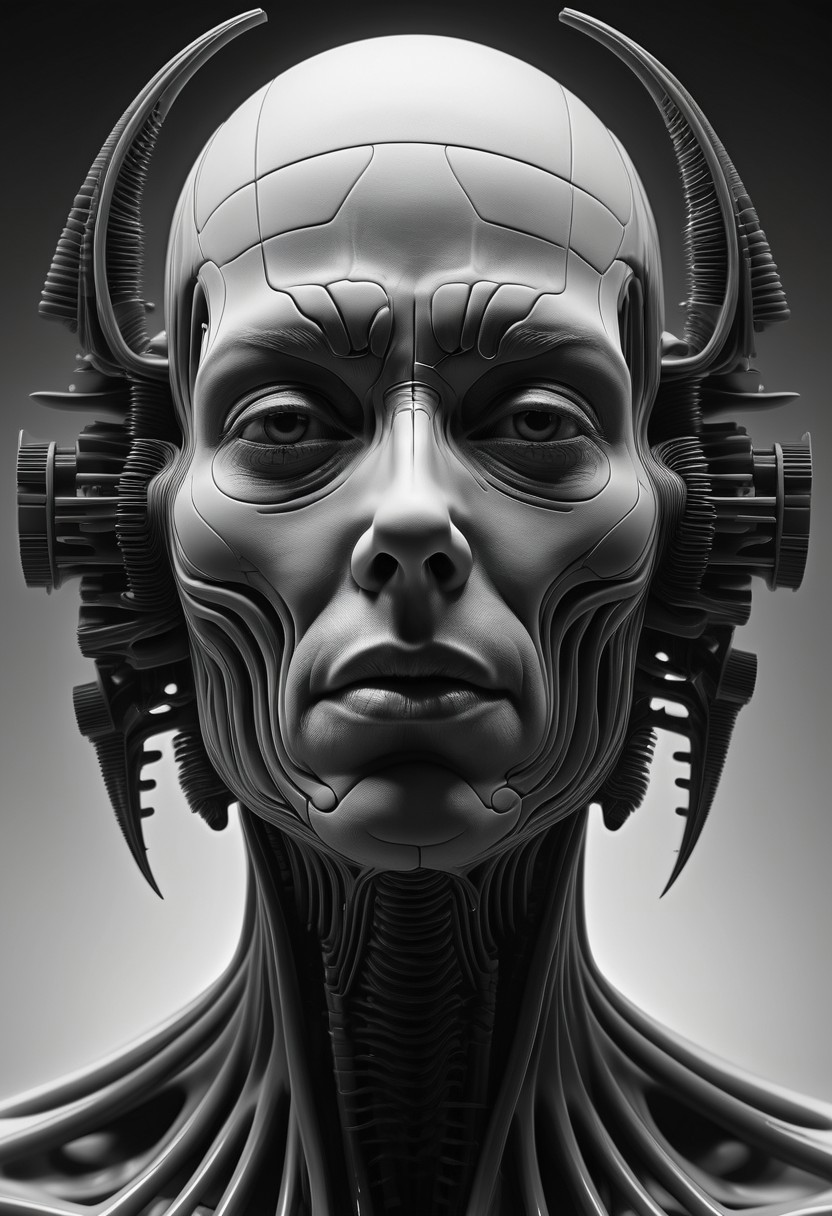 Surreal futuristic portrait of a human head, black and white still, digital Art, perfect composition, beautiful detailed intricate insanely detailed octane render trending on artstation, 8 k artistic photography, photorealistic concept art, soft natural volumetric cinematic perfect light, chiaroscuro, award - winning photograph, masterpiece, oil on canvas, raphael, caravaggio, greg rutkowski, beeple, beksinski, giger