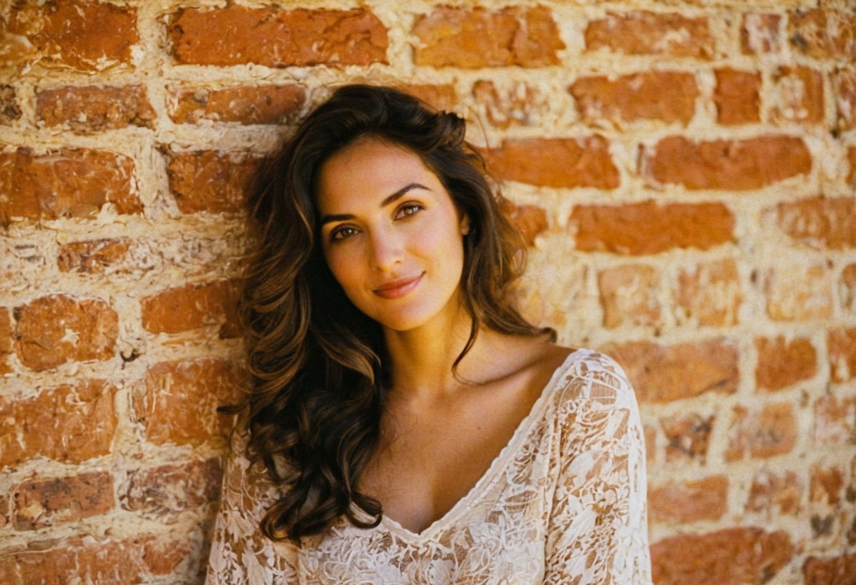what my happy future wife will look like, tuscan rustica, warm colors, the woman has intense, captivating, intimate eyes, leaming at a wall, kodak gold 100 style
