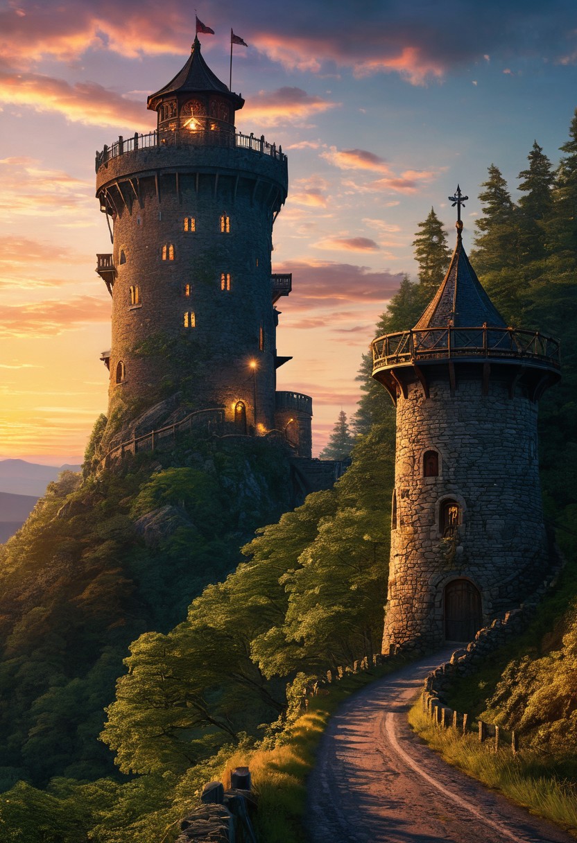 A close-up, portrait of a warrior with a speartip, in the foreground, in the background a single, winding road, leading up through a forest towards a high watchtower on the top on a hill, lights twinkle in the tower as twilight approaches and the sun sets, hyper-detailing, UHD, 3D digital fantasy art, 16K,