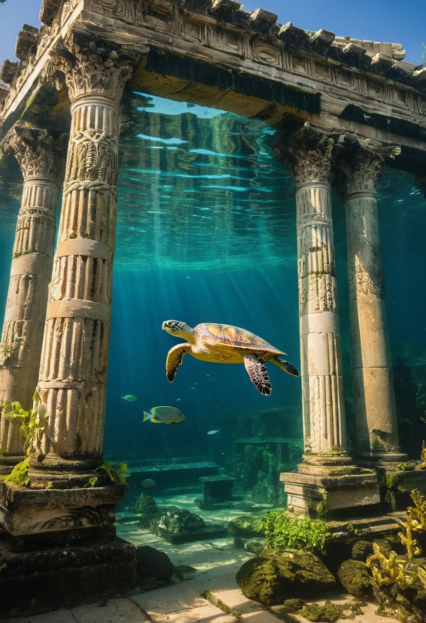 A grand sea turtle gliding gracefully beneath a submerged, ancient Greek temple, tentacles woven around Column Corinthian style, aquatic plants adorning the architecture, both elements fused seamlessly, reminiscent of Marsel van Oosten's underwater secrets, Frans Lanting's harmonious animal portraits, and Roeselien Raimond's fantasy intertwined detailing, shot in the magical light of an