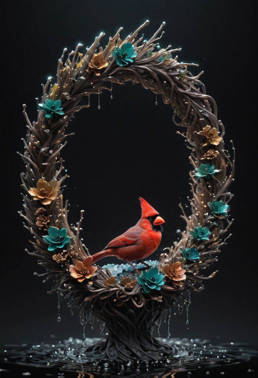 A cardinal bird, incredibly fluid, detailed, 3D fractals, light particles, drops of water, shimmering light, dreamer, surrealist, alcohol ink, smooth, shimmering, dreamy glow, pine cone wreath background conceptual art by Alberto Seveso, Anna Dittmann, Arthur Rackham, 16k