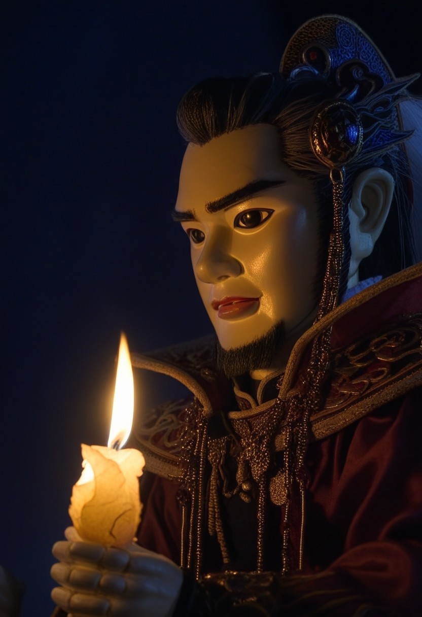 thunderboltfantasy, hIghly detailed photograph of a puppet, dan fei, inside, candlelight, soft lighting, portrait