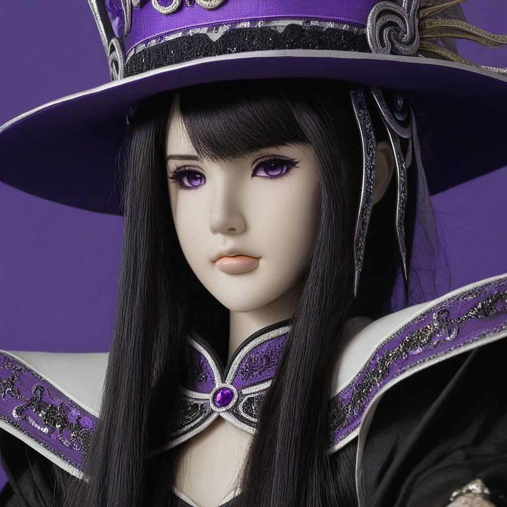 thunderboltfantasy, hIghly detailed photograph, dan fei, 1girl, long hair, black hair, purple eyes, hat, perspective portrait,