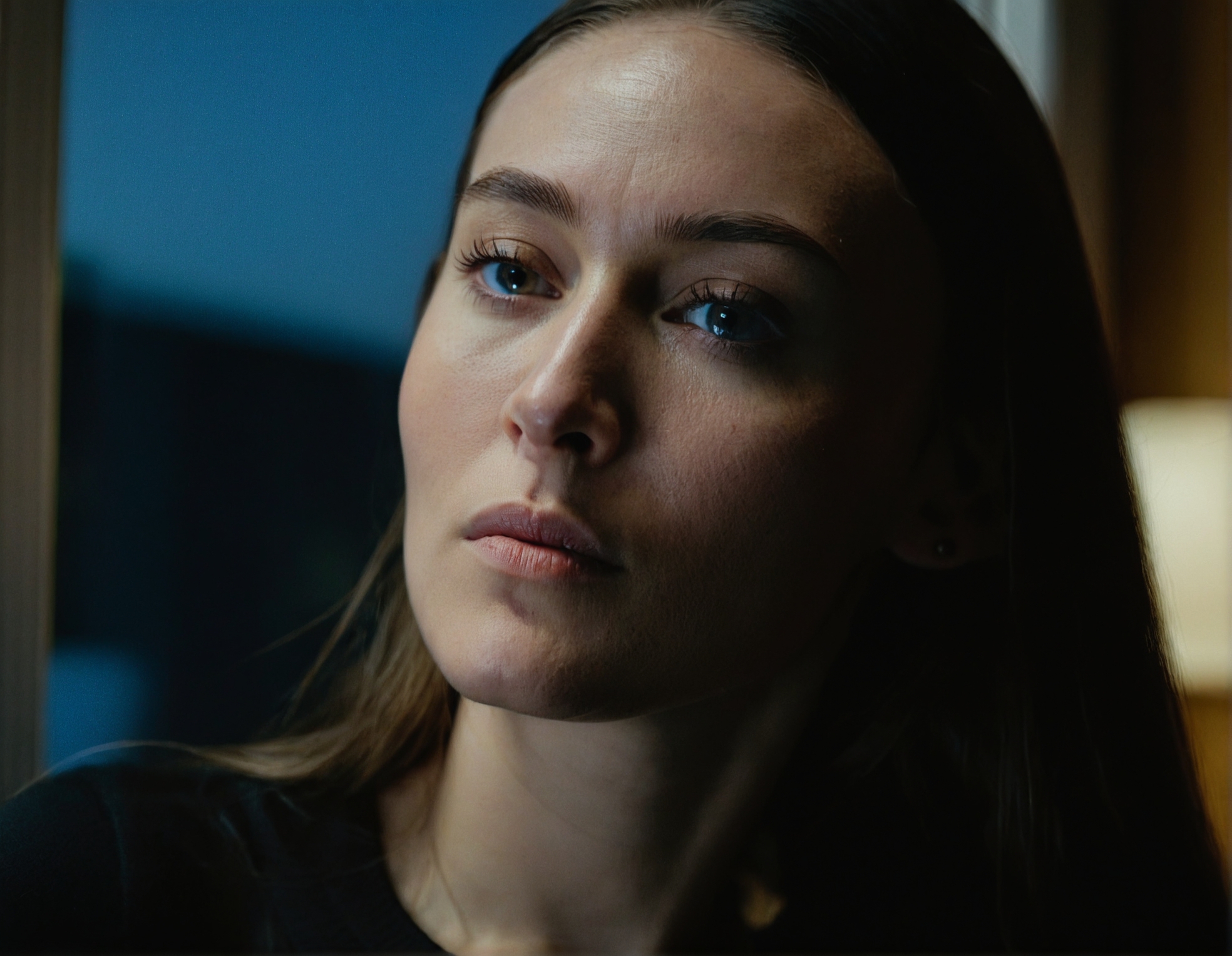 davidfincherstyle, the woman is wearing a black shirt and has long hair. The environment is a room with a window. The shot is a close-up of the woman's face. It is nighttime. The image has a warm color temperature.
