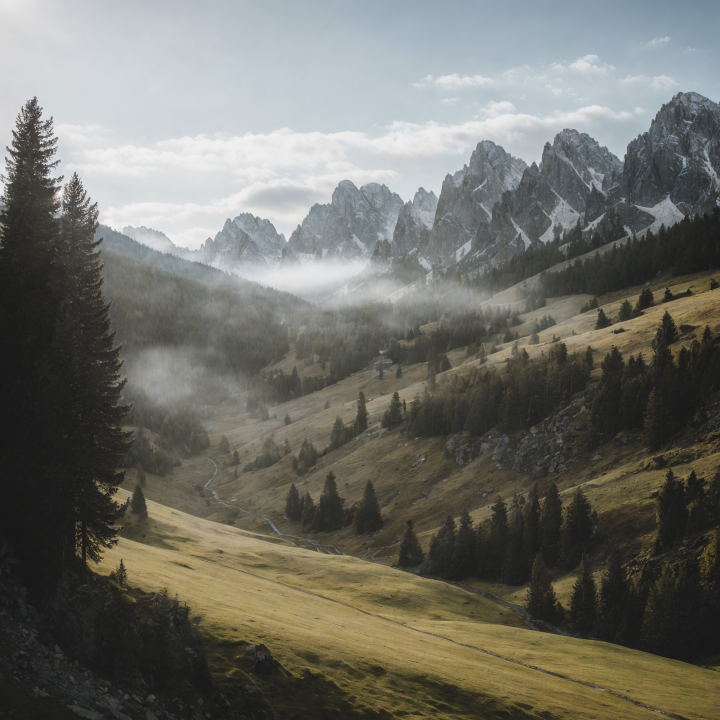 raw photo, 8k uhd, dslr, high quality, (best quality: 1.1), (masterpiece: 1.4), (realisitc: 1.2), (absurdres: 1.2), (photorealistic: 1.3), (great photography in a valley,very high snowmountains),lab color,scenery, outdoors,grass, sky,((strong sunlight)), view from sky,((layerd haze in forests)), landscape,peaceful scene, <lora:ins-lab:0.8>