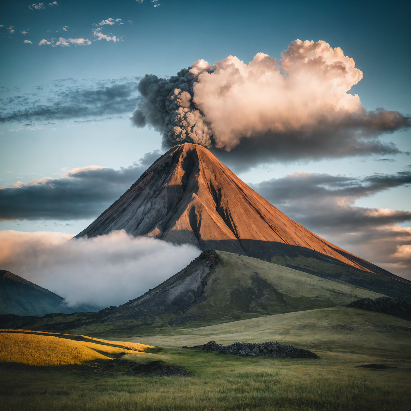 raw photo, 8k uhd, dslr, high quality, (best quality: 1.1), (masterpiece: 1.4), (realisitc: 1.2), (absurdres: 1.2), (photorealistic: 1.3), (great photography of a volcano), ins style,lab color,scenery, outdoors,grass, sky,((beautiful clouds)), view from sky,golden hour, landscape,peaceful scene, <lora:ins-lab:0.8>