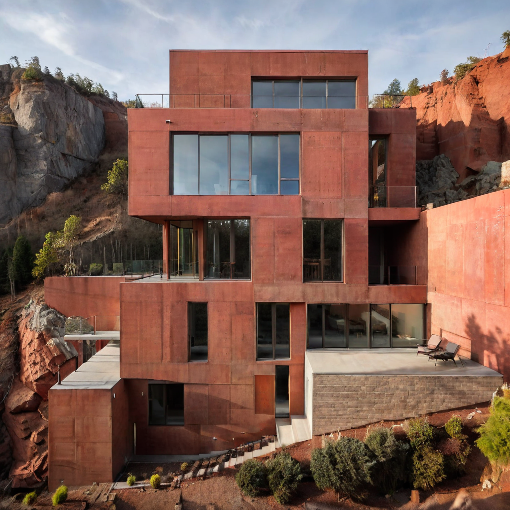 a raw photo of a two-story house features warm red concrete walls that complement the rocky landscape with a refined, modern feel. Large windows invite natural light and views, while dark metal railings add minimalist definition. At golden hour, the concrete glows softly, highlighting the structureâs simple, elegant lines against the cliffside. <lora:xl_more_art-full_v1:0.8> <lora:epi_noiseoffset2:5> <lora:ModernArch_Residence_XL_V1:0.68>