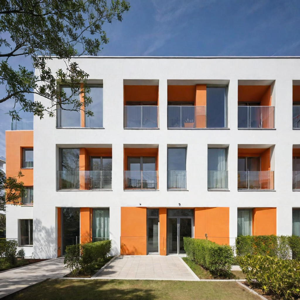 residence, a raw photo of Contemporary mid-rise residential building with a simple rectangular shape, featuring alternating orange and white facades with geometric cutouts on balconies. Glass railings add a sleek touch, while mature trees, including a tall palm, add greenery at the base. Clear daytime sky.<lora:epi_noiseoffset2:5> <lora:ModernArch_Residence_XL_V1:0.68> <lora:xl_more_art-full_v1:0.20>