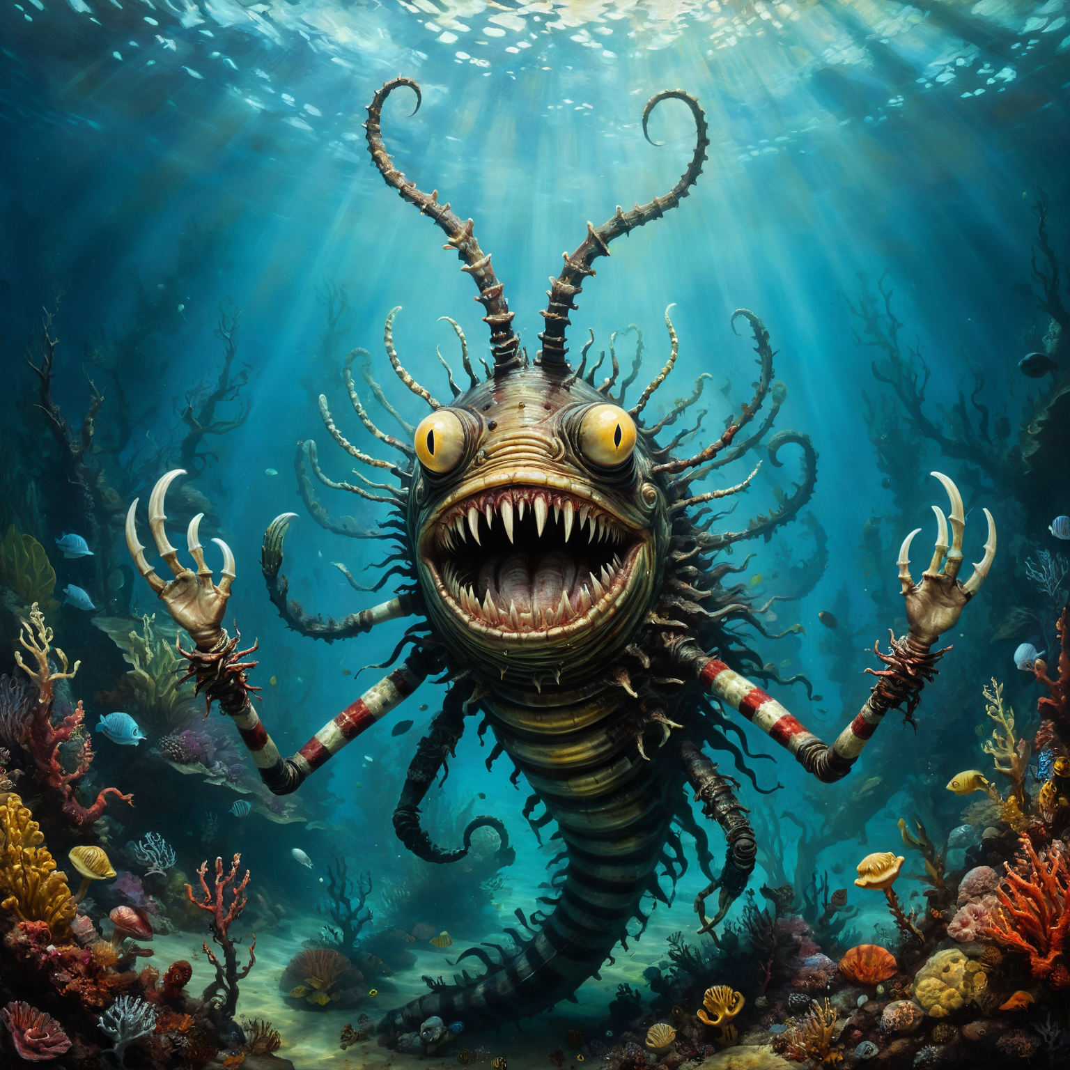 baroque oil painting style, wendigo bobbit worm freediving, under the sea, <lora:confused:1.7>, masterpiece, inspired by (american mcgee's alice madness returns), brush strokes, fine detail <lora:xl_more_art-full_v1:0.8>