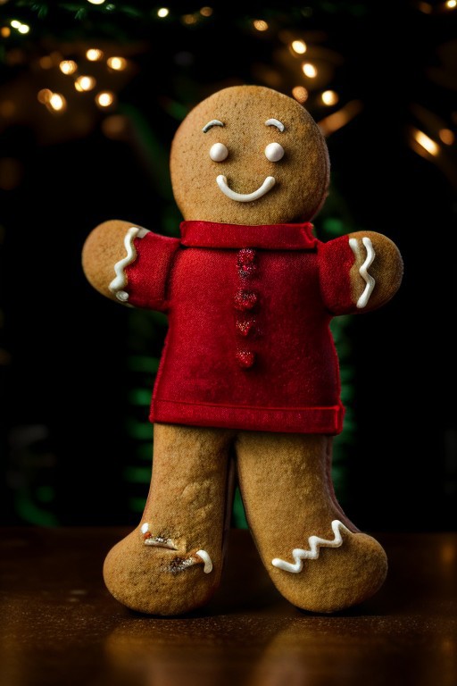 Gingerbread_Man, food, cookie, food focus, no humans, an extremely gritty detailed HD 8K photograph of a gingerbread ban and woman wearing very festive cookie clothing dancing on the table in front of a beautifully decorated pine Christmas tree, detailerlora, beautiful subtle very soft yellow lights