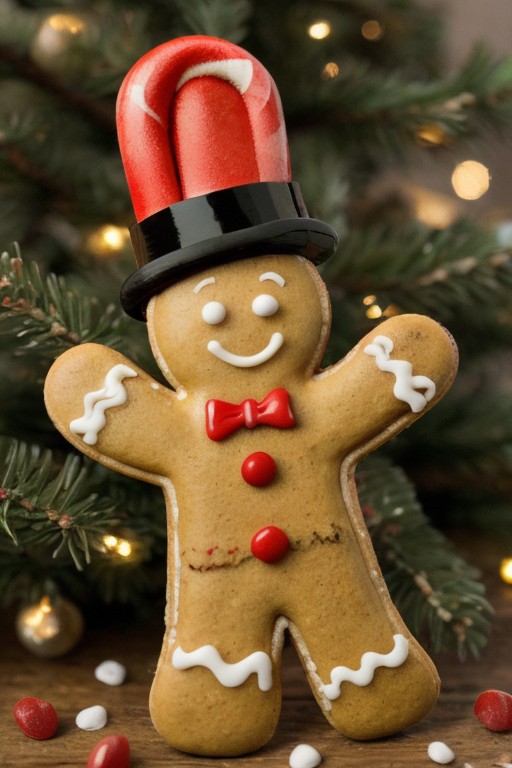 Gingerbread_Man, food, cookie, food focus, no humans, A top hat-toting gingerbread man is lost in a candy cane forest.