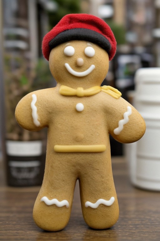 Gingerbread_Man, food, cookie, food focus, no humans, , mustache,wearing a hat, walking in a city street