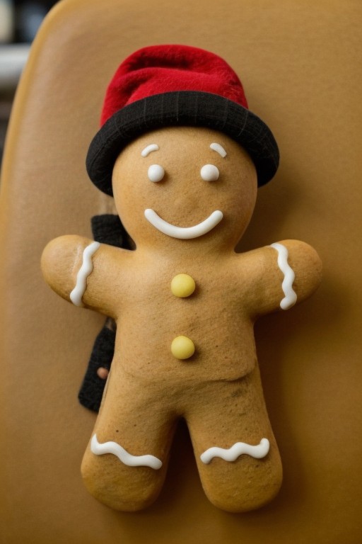 Gingerbread_Man, food, cookie, food focus, no humans, , mustache,wearing a hat, driving a car