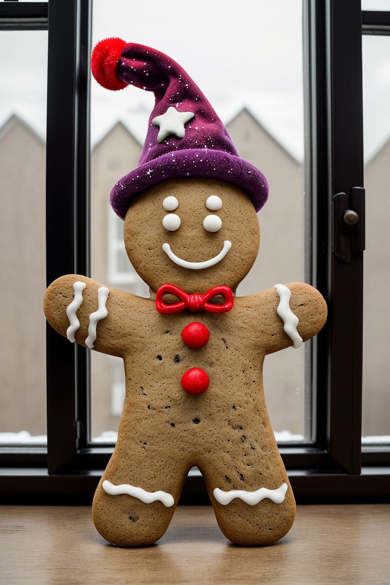 Gingerbread_Man, food, cookie, food focus, no humans, wizard hat, purple hat, white beard, stars, particles, inside, stone wall, window