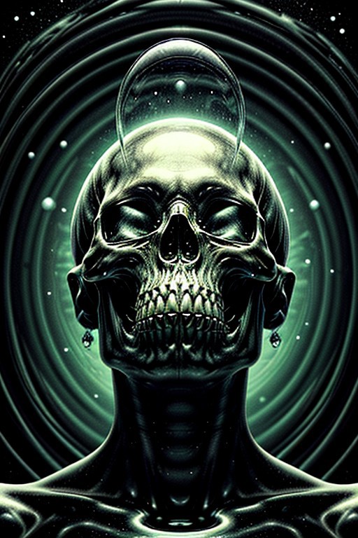 A close-up photorealistic image of a crystal-like floating skull facing dynamic view with its mouth open, pouring from it's mouth a shimmering liquid resembling the universe onto the ground, filled with rich stars and swirling galaxies. A simple void background enhances the dark atmosphere, shrouded in fog, capturing the hypnotic flow and shimmer of the cosmic liquid, from side,