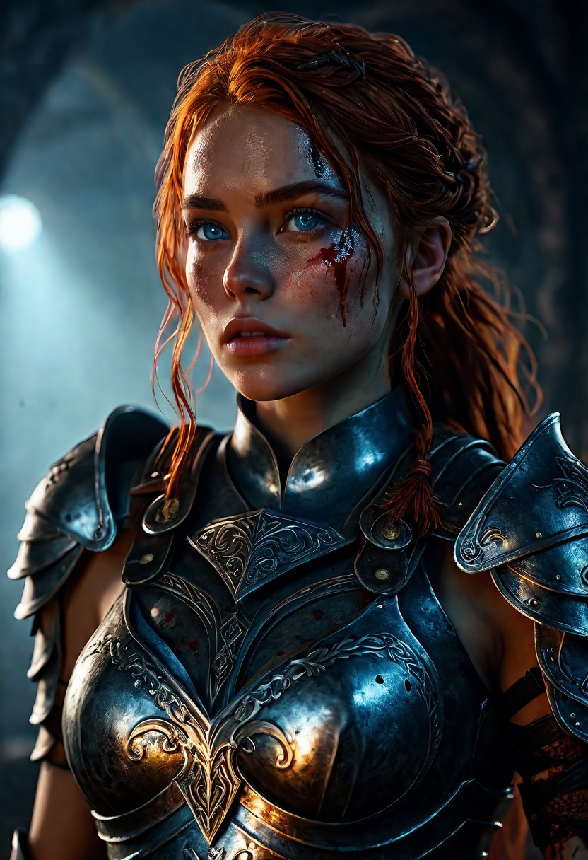 Ultra detailed digital art masterpiece Warrior girl dressed in a iron Armor, Standing on a battlefield at the head of an army of knights, where a bloody slaughter is taking place, standing in battle pose, a dark epic fantasy, perfect lighting, beautiful Sadie Sink as Warrior girl, attractive woman, elegant, sinewy athletic body, unreal engine 5 nanite quality, mixed with dark elements, dark environment, very stormy night, clean dark velour witch clothing, LOTR style, dark washed out eyeliner, no make up, natural bloody face, realistic blue eyes, ultra detailed atmospheric details, beautiful glowing effects, sparkle effects, realistic body proportions, beautiful face proportions, complex masterpiece, wavy red hair, creative glowing detailed tattoos, complex physics, enhanced colors, complimentary colors, ultra detailed raytracing reflections, Ultra detailed complex background, environment feels alive, direct eye contact, dramatic lighting, wet and sweaty skin, beautiful firm Breasts, Concept art portrait by Greg Rutkowski, adding to the intense and dynamic atmosphere of the scene.