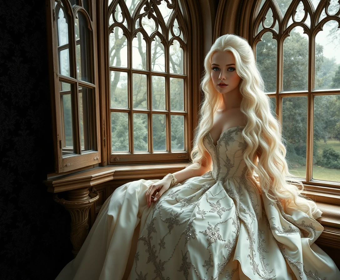 Rococo Style, lush natural settings, mythology, fantastical tableaus, light curved lines, pastel colors, ornamentation, exaggeration, playfulness, delicate brushstrokes, oil paints, Style of Antoine Watteau, Style of François Boucher, Style of François Lemoyne, Style of Jean- Baptiste Pater, Style of Jean- Honore Fragonard, Style of Giovanni Battista Tiepolo, a stunning woman, 3D alcohol ink, extremely long platinum blonde hair, piercing blue eyes, sitting by a bay window on a gothic manor, gothic architecture, long gown is pale white with intricate silver embroidered detail, black wall paper, sparkles on her gown,