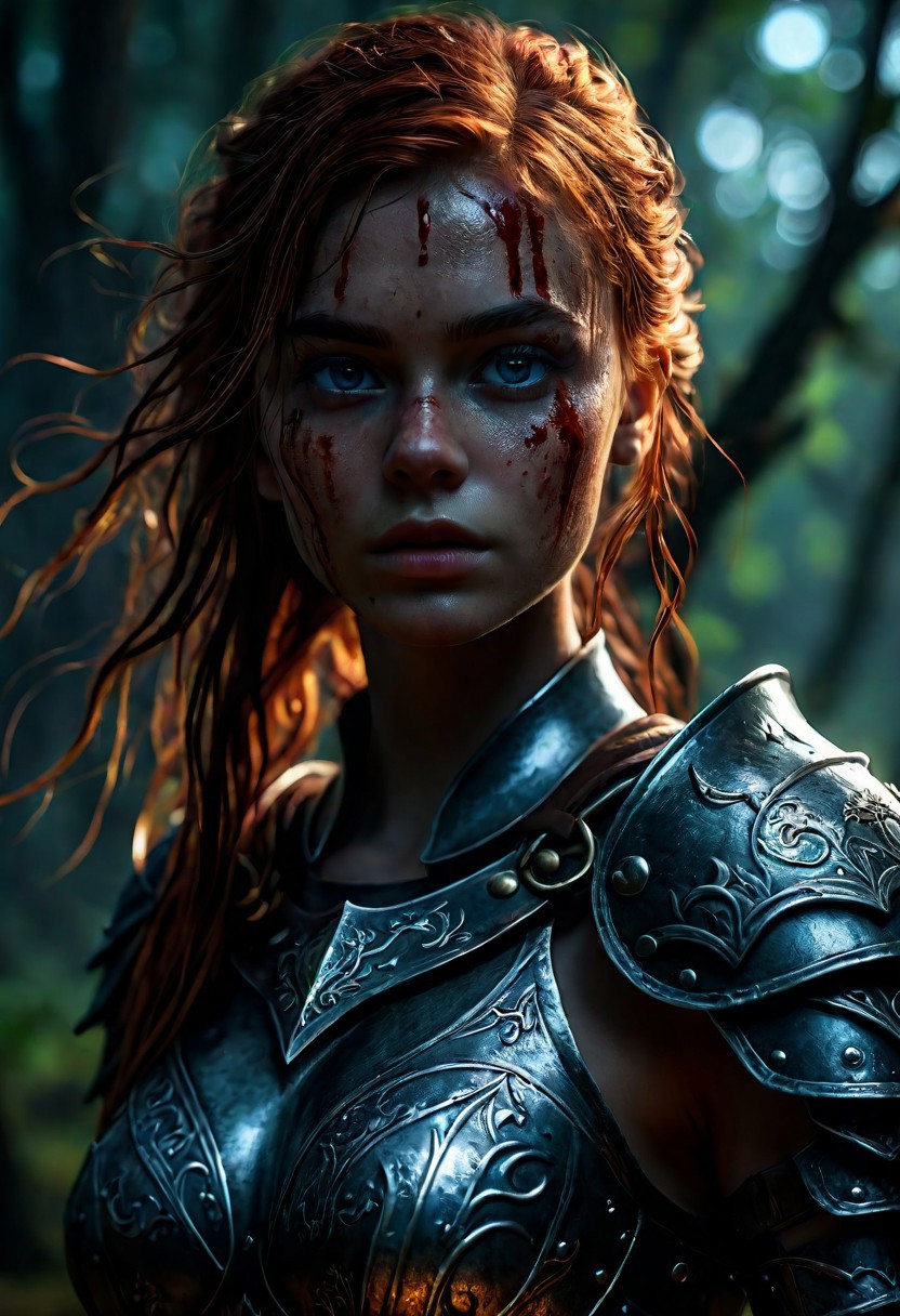 Ultra detailed digital art masterpiece Warrior girl dressed in a iron Armor, Standing on a battlefield at the head of an army of knights, where a bloody slaughter is taking place, standing in battle pose, a dark epic fantasy, perfect lighting, beautiful Sadie Sink as Warrior girl, attractive woman, elegant, sinewy athletic body, unreal engine 5 nanite quality, mixed with dark elements, dark environment, very stormy night, clean dark velour witch clothing, LOTR style, dark washed out eyeliner, no make up, natural bloody face, realistic blue eyes, ultra detailed atmospheric details, beautiful glowing effects, sparkle effects, realistic body proportions, beautiful face proportions, complex masterpiece, wavy red hair, creative glowing detailed tattoos, complex physics, enhanced colors, complimentary colors, ultra detailed raytracing reflections, Ultra detailed complex background, environment feels alive, direct eye contact, dramatic lighting, wet and sweaty skin, beautiful firm Breasts, Concept art portrait by Greg Rutkowski, adding to the intense and dynamic atmosphere of the scene.