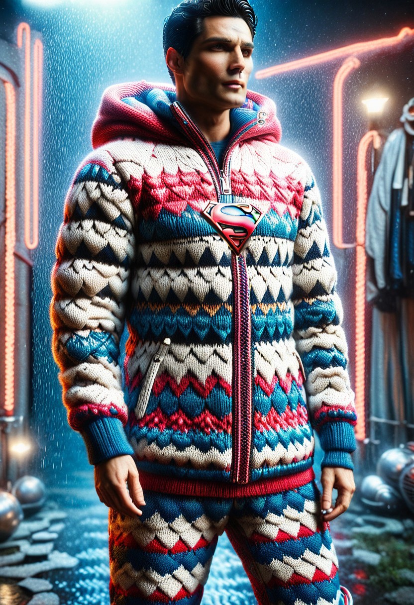 Superman, cinematic, photo, anatomic correct bodies, extremely realistic, lots of detail, full body, hdr, cinematography, raining, epic, night, SilverPulse, fully dressed, p1nk1r1sc4l3s, made out of iridescent scales, nstagram_Influencer_121_By_Stable_Yogi. <lora:coralbugXL:1.6> , coralbugXL, high neck closure, fully dressed, puffer_downsuit, ChristmasSweater, Clothes have Superman Sweater pattern.
