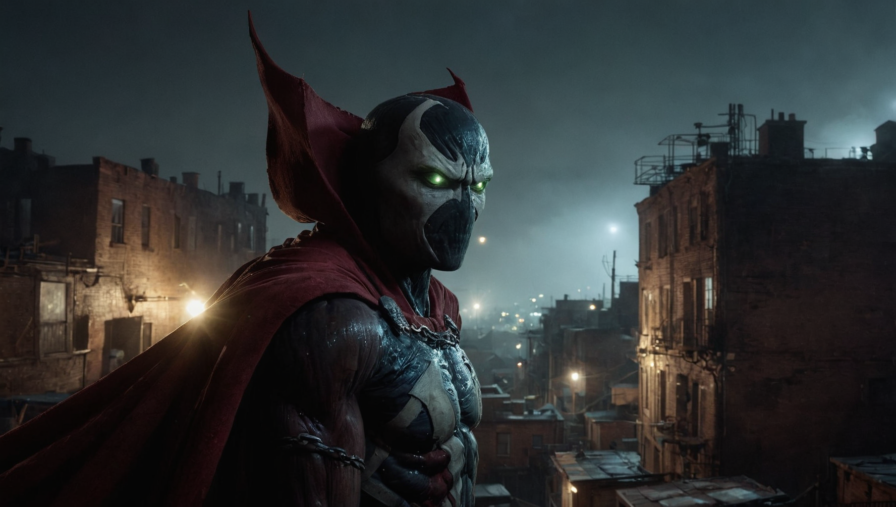 award winning photograph of <lora:Spawn:1> Spawn looking away showing back of cape, head and high collar in 3rd person view on in new york city slum at night, enviornment design, magical, whimsical, fantasy art concept, best quality, masterpiece, ultra sharp, hyper realistic, realism, atmospheric fog, looking far into the distance, thirdperson view (facing away:2), ((view from behind)) from camera, wide-angle, full-body, camera facing horizon, 3rd person view, Extreme Long Shot (ELS), long shot, distanced from camera, centered in high angle view, shot in third person camera, photographed on arri alexa, camera placed at 20ft above the ground, overhead shot, head to toe, feet on ground, overhead camera, environment focus, high aperture, epic award winning photograph (subsurface scattering:1.3), intracate details, ambient occlusion, global illumination, realism, hyper realistic, hyper detailed, score_9, score_8_up, score_7_up