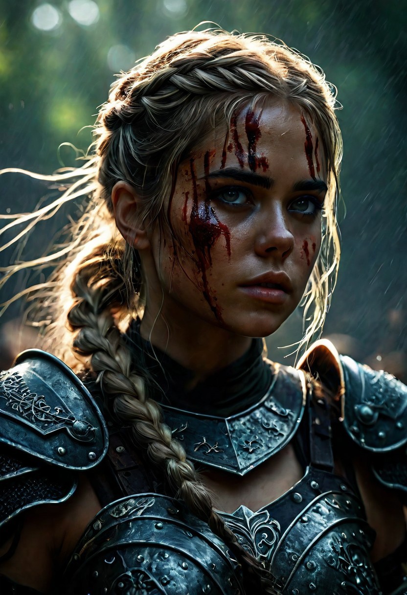 Ultra detailed digital art masterpiece Warrior Viking girl dressed in a iron Armor, Standing on a battlefield at the head of an army of knights, where a bloody slaughter is taking place, standing in battle pose, a dark epic fantasy, perfect lighting, beautiful Kiernan Shipka as Warrior Viking girl, attractive woman, elegant, sinewy athletic body, unreal engine 5 nanite quality, mixed with dark elements, dark environment, very stormy day, clean dark velour witch clothing, LOTR style, dark washed out eyeliner, no make up, natural bloody face, realistic brown eyes, ultra detailed atmospheric details, beautiful glowing effects, sparkle effects, realistic body proportions, beautiful face proportions, complex masterpiece, wavy blonde hair, hair braided into pigtails, creative glowing detailed tattoos, complex physics, enhanced colors, complimentary colors, ultra detailed raytracing reflections, Ultra detailed complex background, environment feels alive, direct eye contact, dramatic lighting, wet and sweaty skin, beautiful firm Breasts, Daylight, Concept art portrait by Greg Rutkowski, adding to the intense and dynamic atmosphere of the scene.