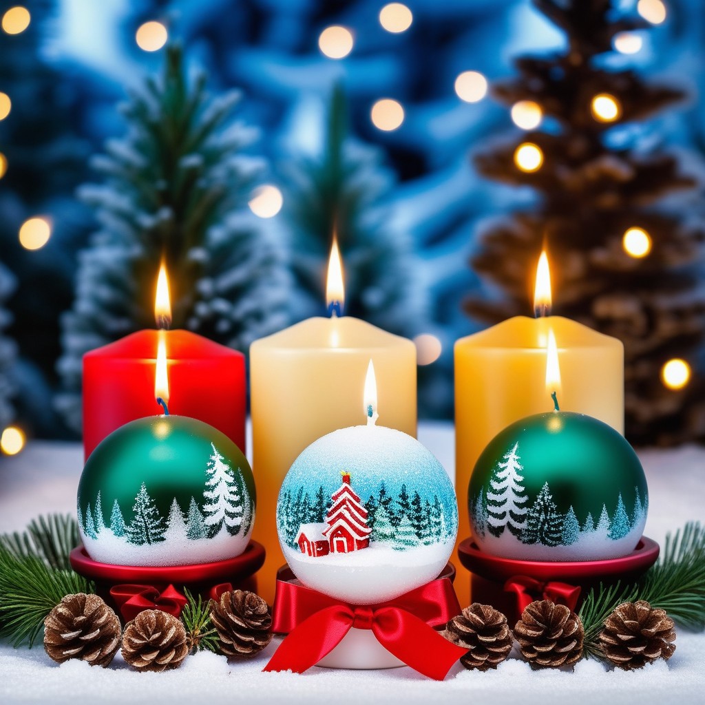 three Christmas candles with snowy fir trees painted on top, Christmas balls at the bottom of the candles, in the background a crystal ball and connifer forest