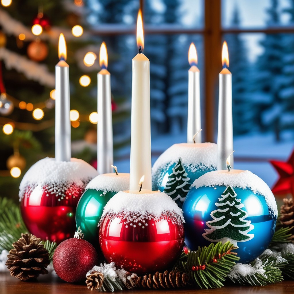 three Christmas candles with snowy fir trees painted on top, Christmas balls at the bottom of the candles, in the background a crystal ball and connifer forest