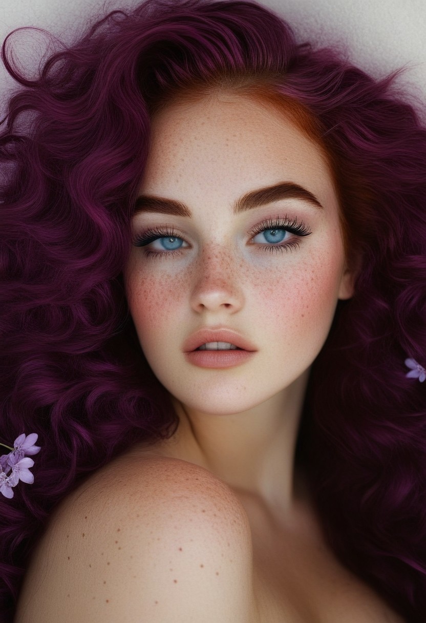 This is a high-resolution, highly detailed photograph of a young woman with an ethereal, dreamy quality. She has light, creamy skin and striking, piercing blue eyes that are wide open, gazing directly at the camera. Her face is covered in tiny, sparkling snow specks, likely a makeup effect, which adds a magical, otherworldly glow to her appearance. Her skin is dotted with freckles, particularly prominent on her nose and cheeks. Her long, wavy hair is a vibrant, neon purple, cascading down her shoulders, and adored with tiny lilac blossoms blending into her surroundings.rockabilly style, 1girl, freckles, solo, flower, looking at viewer, pink hair, pink flower, long hair, eyelashes, portrait, 1950's