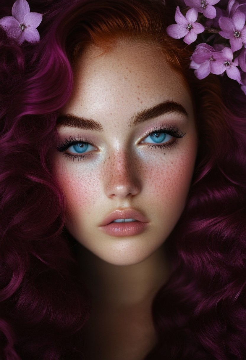 This is a high-resolution, highly detailed photograph of a young woman with an ethereal, dreamy quality. She has light, creamy skin and striking, piercing blue eyes that are wide open, gazing directly at the camera. Her face is covered in tiny, sparkling snow specks, likely a makeup effect, which adds a magical, otherworldly glow to her appearance. Her skin is dotted with freckles, particularly prominent on her nose and cheeks. Her long, wavy hair is a vibrant, neon purple, cascading down her shoulders, and adored with tiny lilac blossoms blending into her surroundings.rockabilly style, 1girl, freckles, solo, flower, looking at viewer, pink hair, pink flower, long hair, eyelashes, portrait, 1950's
