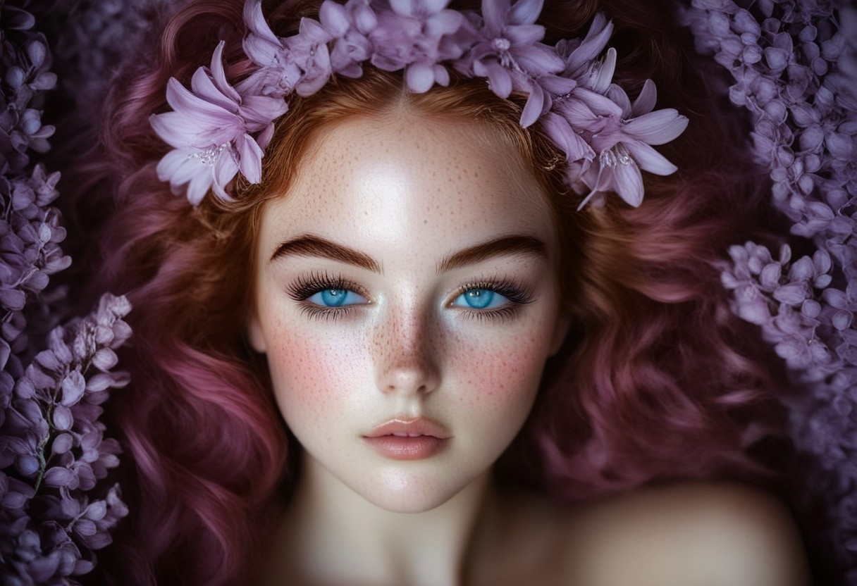 This is a highly detailed, high-definition photograph featuring a young woman with an ethereal, dreamy quality. She has striking, striking blue eyes with long, dark lashes and is adorned with a radiant, sun-kissed complexion covered in tiny, glittering specks, and lilac flowers, giving a magical, fairy-like appearance. Her hair is a vibrant, pastel pink color, styled in loose waves and adorned with a crown of fresh, blooming purple flowers, primarily lilacs, adding to her whimsical, otherworldly look.rockabilly style, 1girl, solo, realistic, pink hair, flower, looking at viewer, freckles, portrait, blue eyes, lips, 1950's