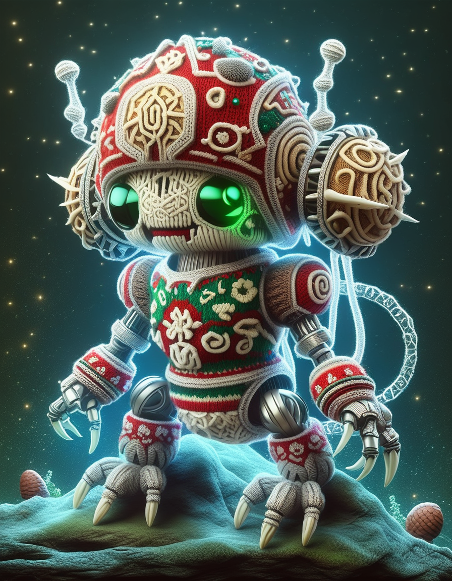 ChristmasSweater, Highly detailed Dynamic shot of majestic adorable (myconid mecha:1.3), (mushroom goblin:1.2), high quality, beautiful masterpiece, fantasy creature, kawaii, digital art, glowing sparkles