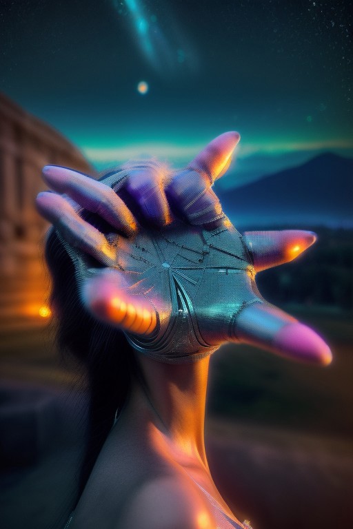 A goddess-like humanoid AI, standing majestically atop a celestial mountain, her form glowing with a divine aura. She has radiant golden skin with intricate, ancient symbols etched into her body, resembling starlight patterns. Her hair is a cascade of galaxies, blending blues, purples, and silvers. She holds an orb of pure energy in one hand, surrounded by floating fragments of futuristic temples. Art style: cosmic, regal, and surreal with high-contrast lighting and vibrant colors, bird eye view,