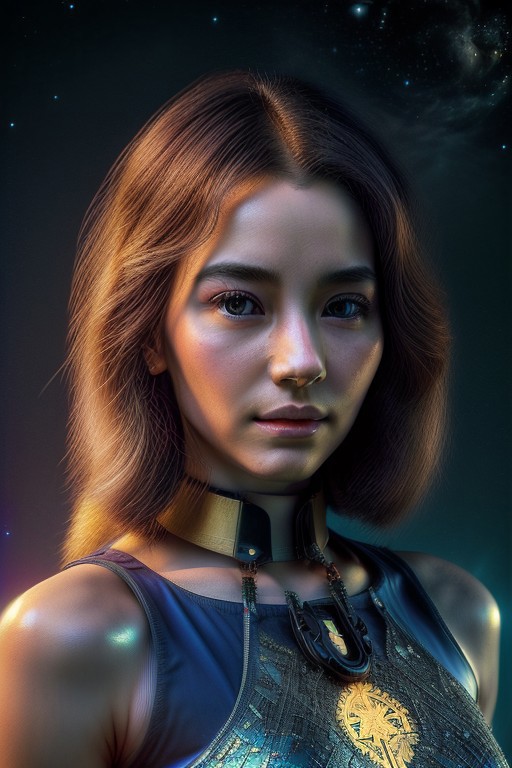 A goddess-like humanoid AI, standing majestically atop a celestial mountain, her form glowing with a divine aura. She has radiant golden skin with intricate, ancient symbols etched into her body, resembling starlight patterns. Her hair is a cascade of galaxies, blending blues, purples, and silvers. She holds an orb of pure energy in one hand, surrounded by floating fragments of futuristic temples. Art style: cosmic, regal, and surreal with high-contrast lighting and vibrant colors, bird eye view,