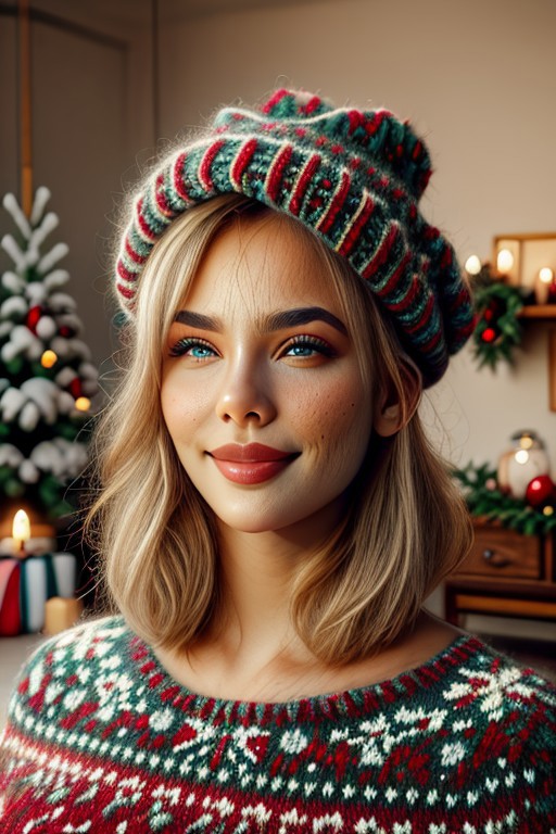 christmassweater, Masterpiece, 1female, detailed, realistic photo, portrait, face focus, close up, European, female, red lips, gentle smile, 28 years old, realistic high detailed face, natural eyes, anatomic correct bodies, lots of detail, colorful, hdr, strong, mature female, beautiful, dull_natural_skin, skin texture style, detailed skin pore, detailed skin, realistic skin, cinematic, elegant, hyperrealistic, hyperrealism, Christmas sweater, colorful sweater, living room, Christmas tree, Christmas decorations, Christmas, hands hidden, hands out of view, bangs, falkems, makeup, hat, lipstick, garrison cap.