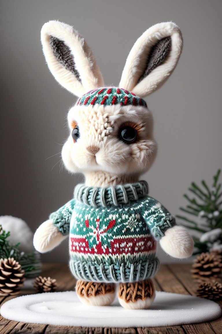 cute, plush toy, christmassweater, rabbit, white fur, outside, snow, forest, snowing, blue sky