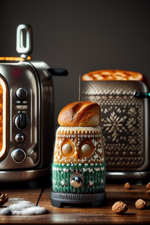 a toaster, cute, toast, butter, Masterpiece, detailed, realistic photo, portrait, face focus, high detailed, lots of detail, colorful, hdr, strong, Christmas sweater with toasters on it, colorful sweater, garden, winter, Christmas tree, Christmas decorations, Christmas,