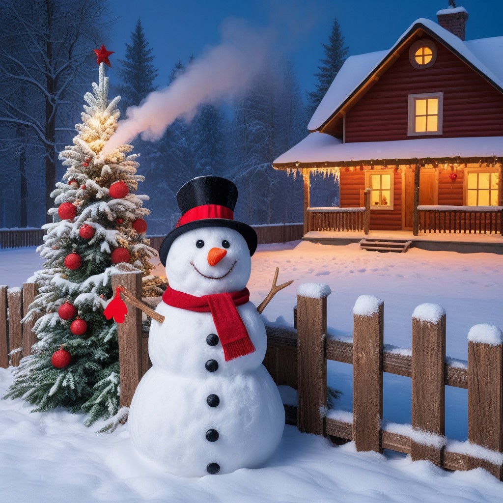 snowman near a wooden fence with cardinals, background Christmas tree and snowy house, illuminated with smoke coming out of the chimney