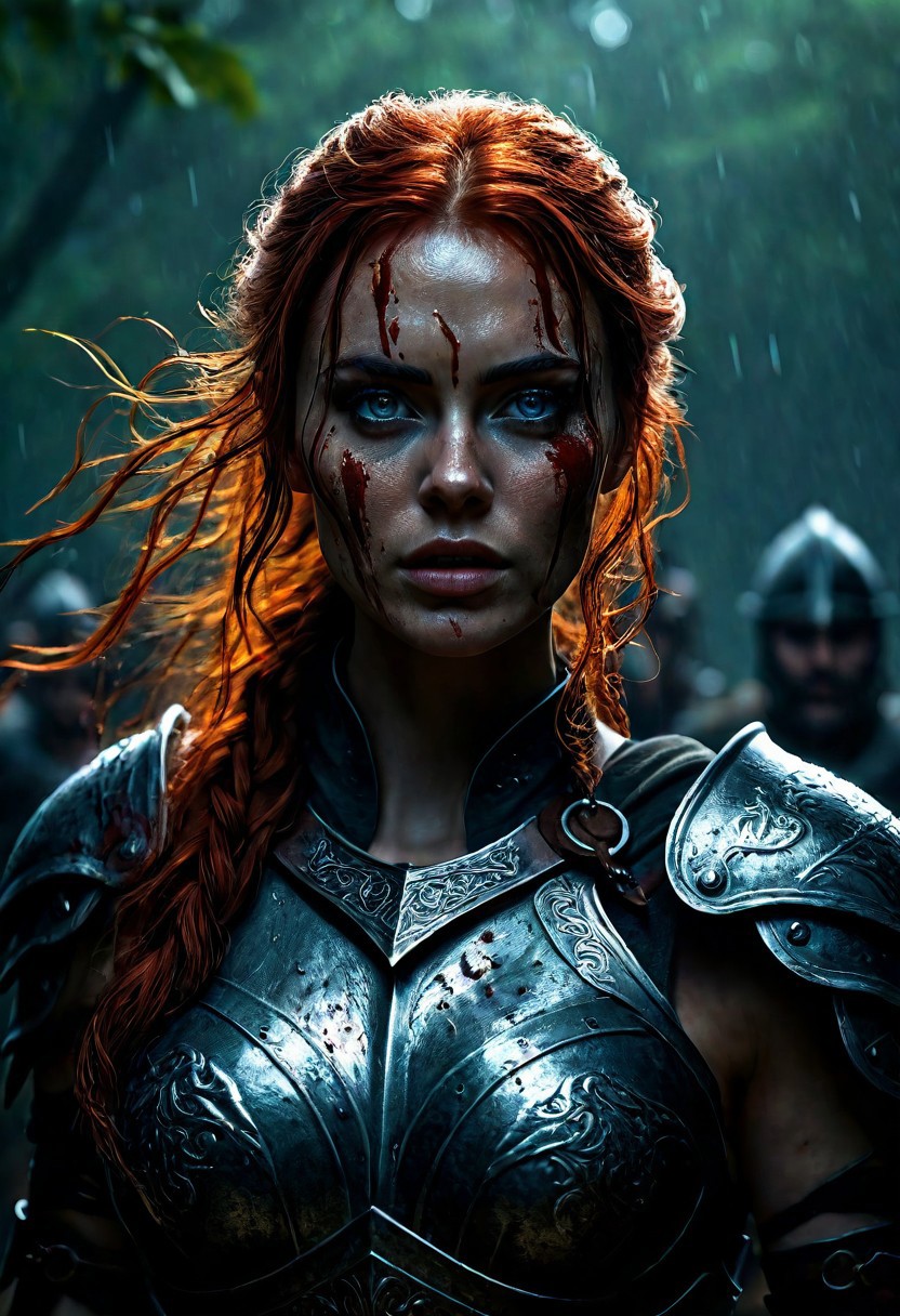 Ultra detailed digital art masterpiece Warrior Viking girl dressed in a iron Armor, Standing on a battlefield at the head of an army of knights, where a bloody slaughter is taking place, standing in battle pose, a dark epic fantasy, perfect lighting, beautiful Sadie Sink as Warrior Viking girl, attractive woman, elegant, beautiful woman of athletic body, unreal engine 5 nanite quality, mixed with dark elements, dark environment, very stormy day, LOTR style, dark washed out eyeliner, no make up, natural bloody pale face, realistic blue eyes, ultra detailed atmospheric details, beautiful glowing effects, sparkle effects, realistic body proportions, beautiful face proportions, complex masterpiece, wavy red hair, creative glowing detailed tattoos, complex physics, enhanced colors, complimentary colors, ultra detailed raytracing reflections, Ultra detailed complex background, environment feels alive, direct eye contact, dramatic lighting, wet and sweaty skin, beautiful firm Breasts, Daylight, Concept art by Greg Rutkowski, adding to the intense and dynamic atmosphere of the scene.